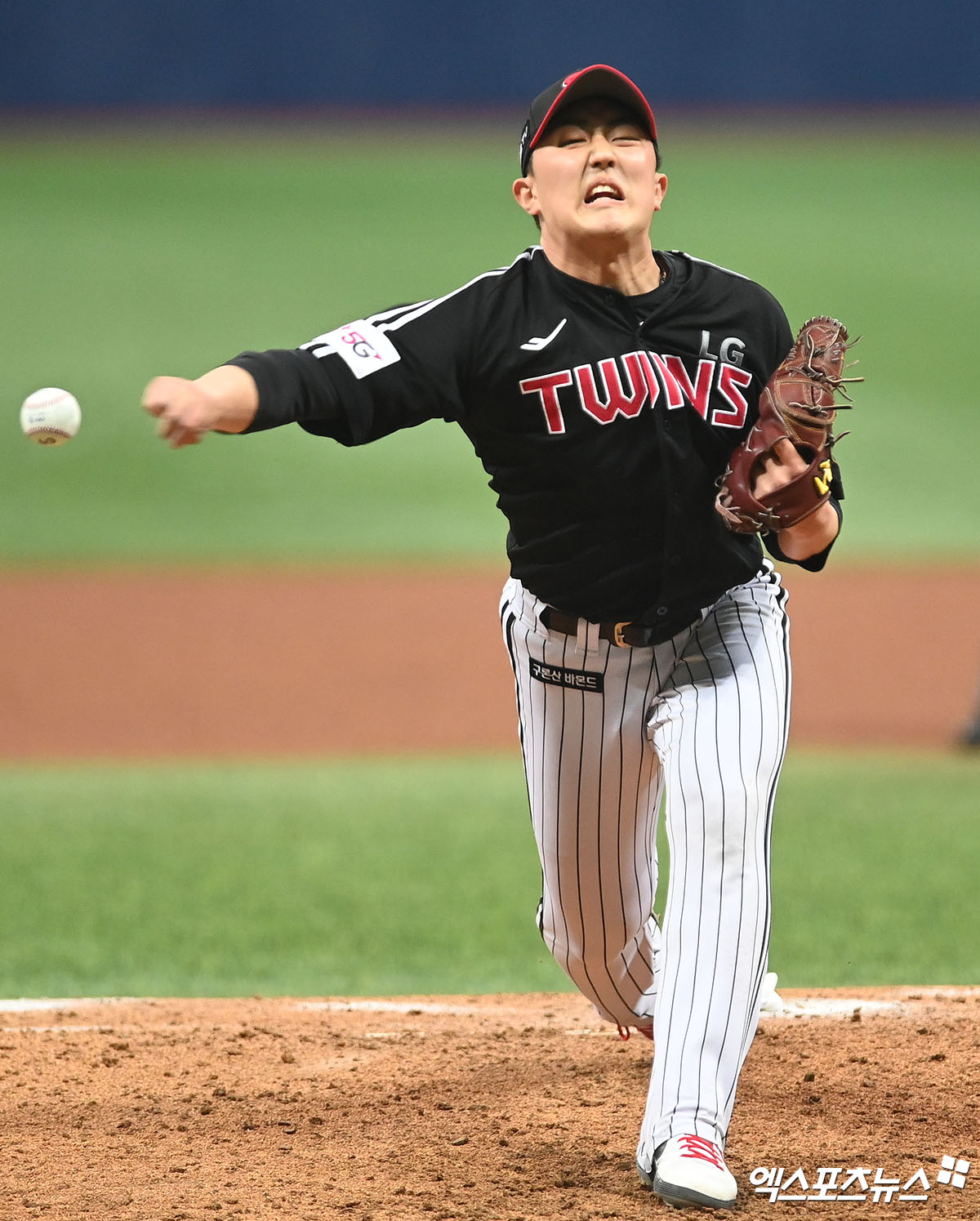 (엑스포츠뉴스 고척, 김한준 기자) 15일 오후 서울시 구로구 고척스카이돔에서 열린 ’2022 신한은행 SOL KBO리그’ LG 트윈스와 키움 히어로즈의 시범경기, 7회말 LG 최용하가 공을 힘차게 던지고 있다.
