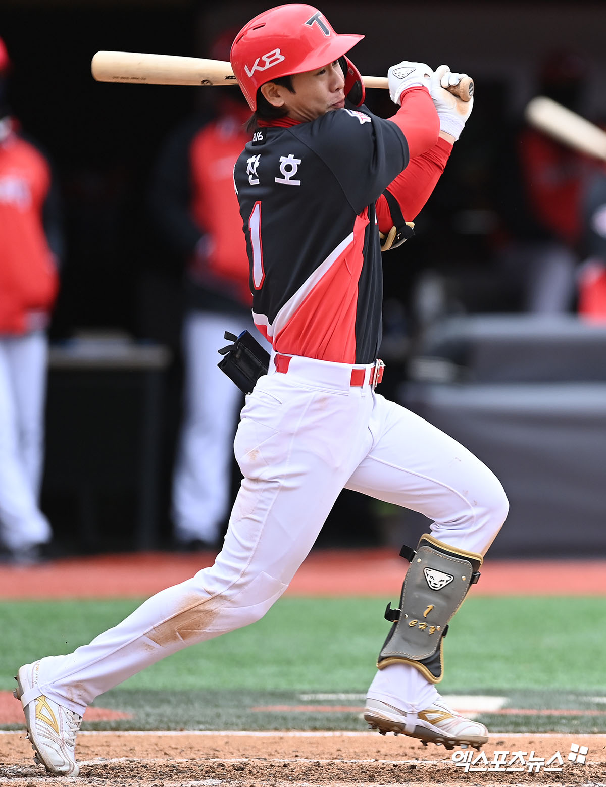 (엑스포츠뉴스 수원, 김한준 기자) 18일 오후 수원 KT위즈파크에서 열린 ’2022 신한은행 SOL KBO리그’ KIA 타이거즈와 KT 위즈의 시범경기, 8회초 1사 만루 KIA 박찬호가 타격을 하고 있다. 결과는 더블플레이 아웃.