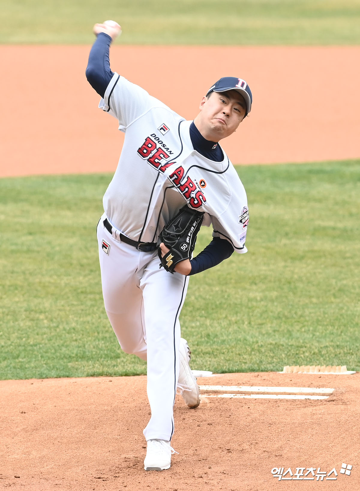 (엑스포츠뉴스 잠실, 고아라 기자) 24일 오전 서울 송파구 잠실야구장에서 열리는 '2022 KBO리그' LG 트윈스와 두산 베어스의 시범경기, 1회초 두산 선발투수 이영하가 공을 힘차게 던지고 있다.
