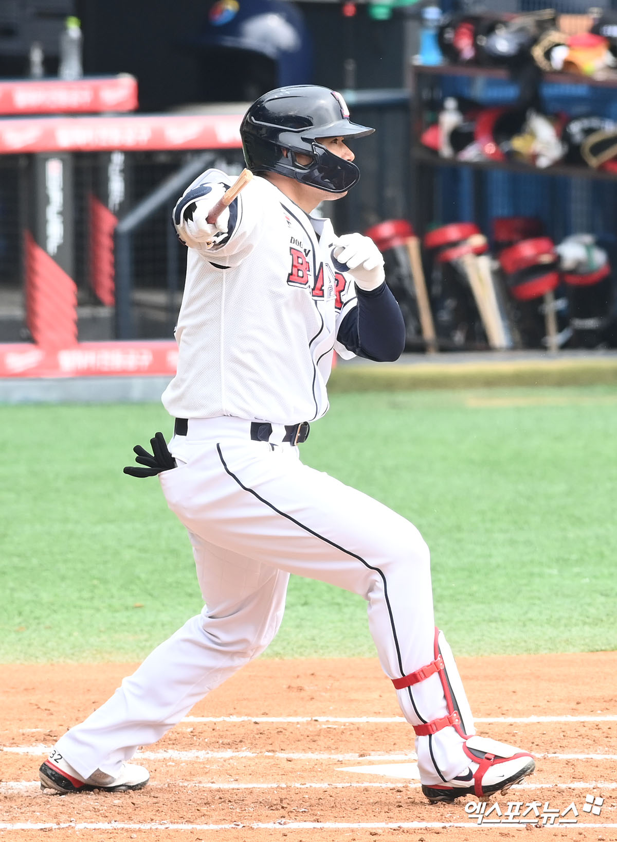 (엑스포츠뉴스 잠실, 고아라 기자) 24일 오전 서울 송파구 잠실야구장에서 열리는 '2022 KBO리그' LG 트윈스와 두산 베어스의 시범경기, 2회말 무사 두산 김재환이 1루타를 날리고 있다.