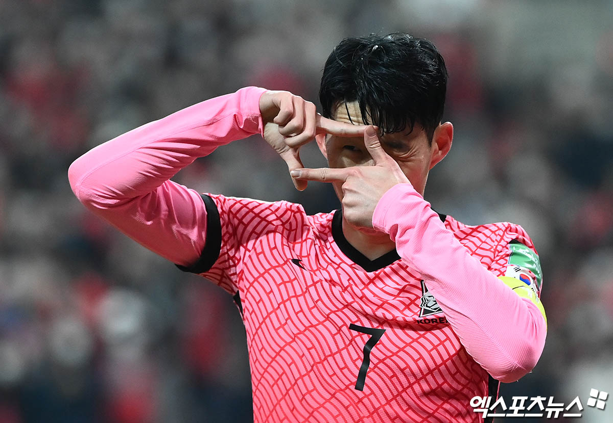(엑스포츠뉴스 서울월드컵경기장, 박지영 기자) 24일 오후 서울 성산동 서울월드컵경기장에서 열린 '2022 카타르 월드컵 아시아지역 최종예선 A조 9차전' 대한민국과 이란의 경기, 전반 대한민국 손흥민이 선제골을 넣은 뒤 세리머니를 하고 있다.