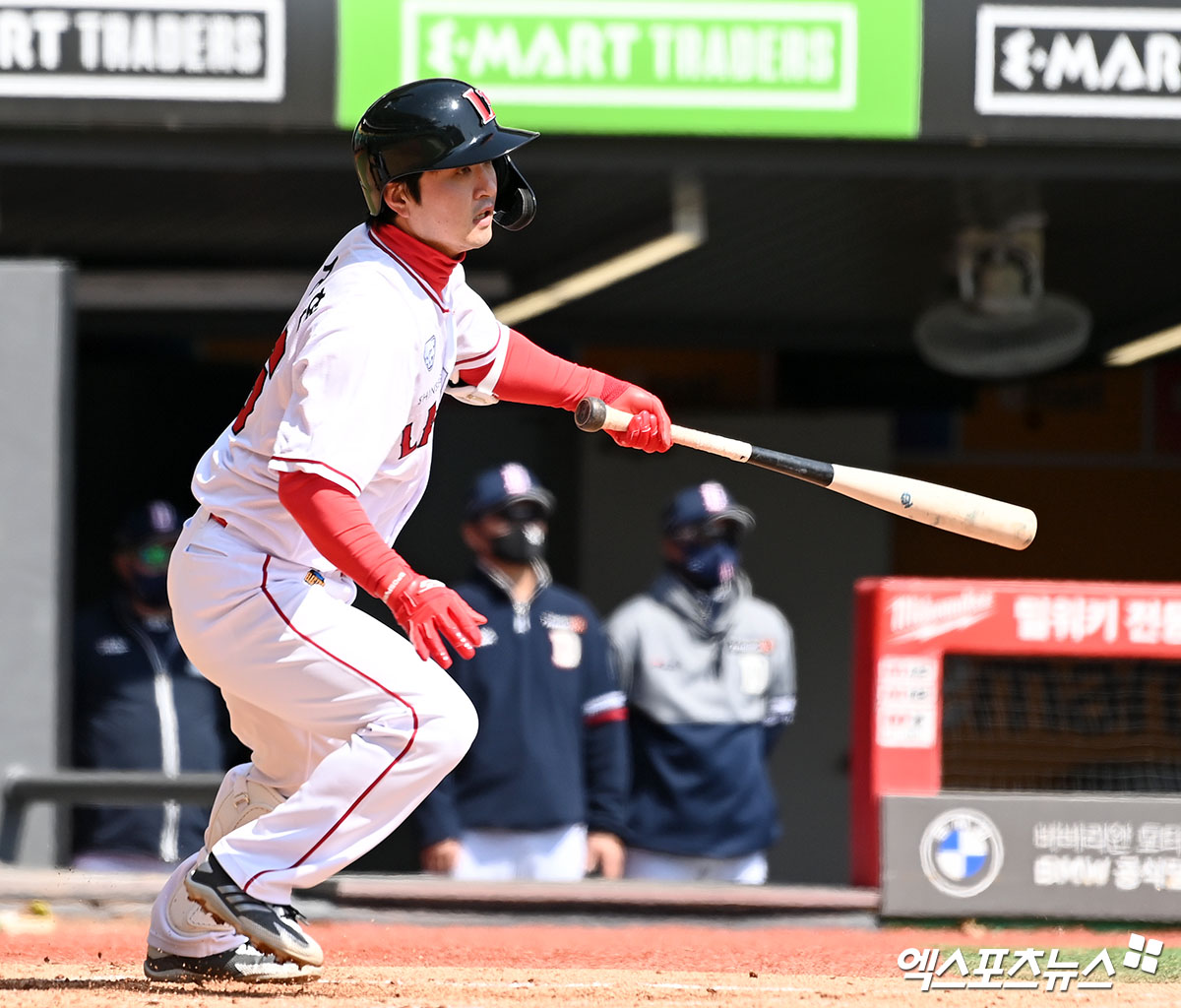 (엑스포츠뉴스 인천, 김한준 기자) 27일 오후 인천 SSG랜더스필드에서 열린 ’2022 신한은행 SOL KBO리그’ 두산 베어스와 SSG 랜더스의 경기, 2회말 무사 1,2루 SSG 김성현이 우전안타를 날리고 있다.