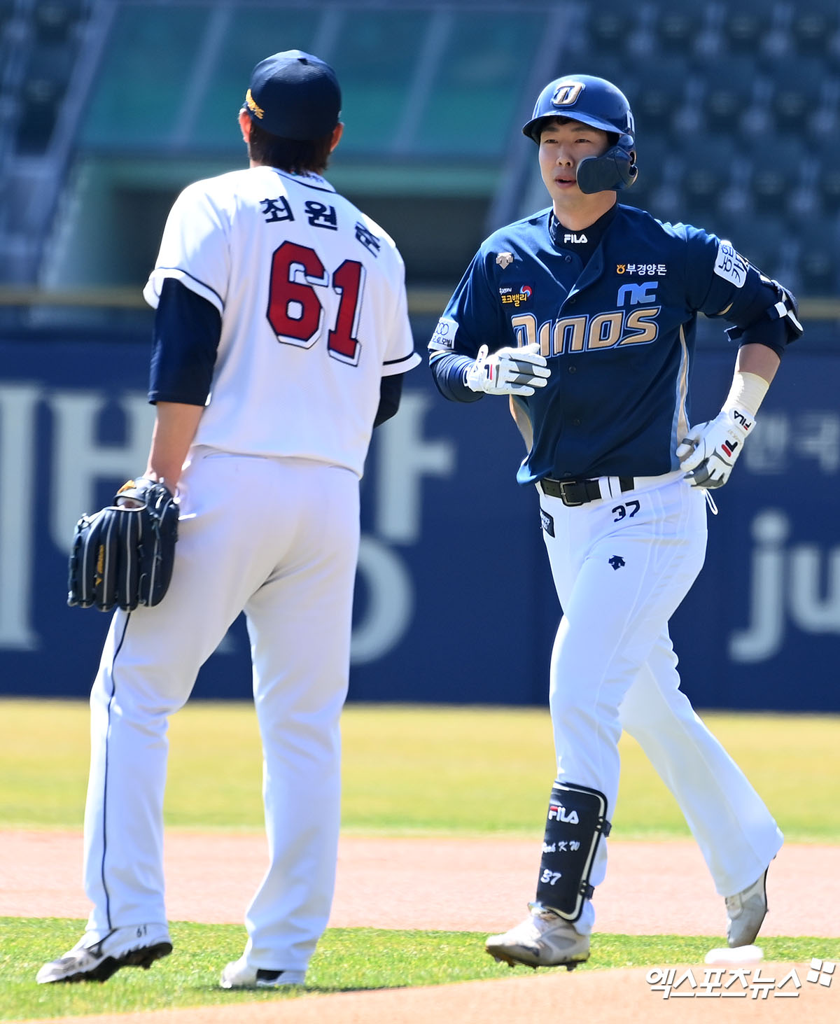 (엑스포츠뉴스 잠실, 김한준 기자) 28일 오후 서울 송파구 잠실야구장에서 열린 ’2022 신한은행 SOL KBO리그’ NC 다이노스와 두산 베어스의 시범경기, 1회초 NC 박건우가 유격수 플라이로 아웃된 후 두산 선발투수 최원준 곁을 지나가고 있다.