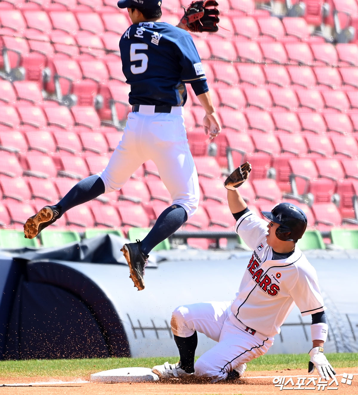 (엑스포츠뉴스 잠실, 김한준 기자) 28일 오후 서울 송파구 잠실야구장에서 열린 ’2022 신한은행 SOL KBO리그’ NC 다이노스와 두산 베어스의 시범경기, 1회말 무사 1루 상황에서 2루 도루를 시도한 허경민이 NC 박대온의 송구 실책을 틈타 3루까지 진루하고 있다.