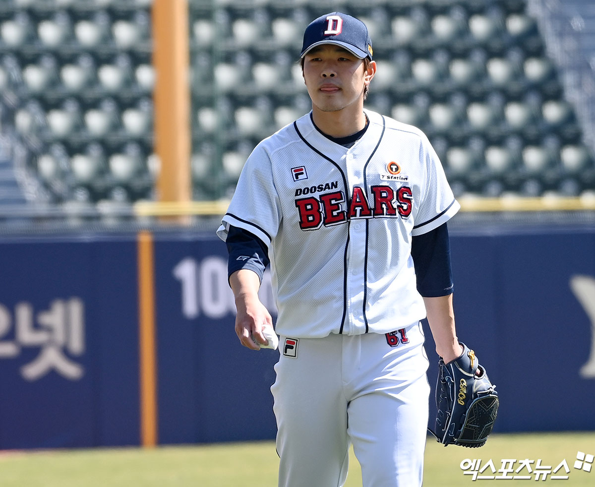 (엑스포츠뉴스 잠실, 김한준 기자) 28일 오후 서울 송파구 잠실야구장에서 열린 ’2022 신한은행 SOL KBO리그’ NC 다이노스와 두산 베어스의 시범경기, 3회초 수비를 마친 두산 선발투수 최원준이 마운드를 내려오고 있다.