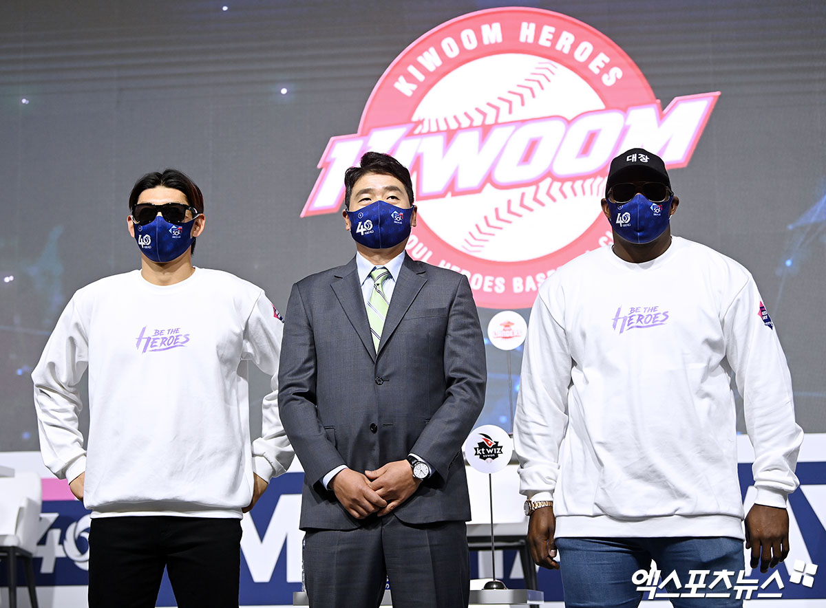 (엑스포츠뉴스 한남동, 김한준 기자) 31일 오후 서울 한남동 그랜드하얏트서울에서 열린 ‘2022 신한은행 SOL KBO’ 미디어데이, 키움 이정후, 홍원기 감독, 푸이그가 포즈를 취하고 있다.