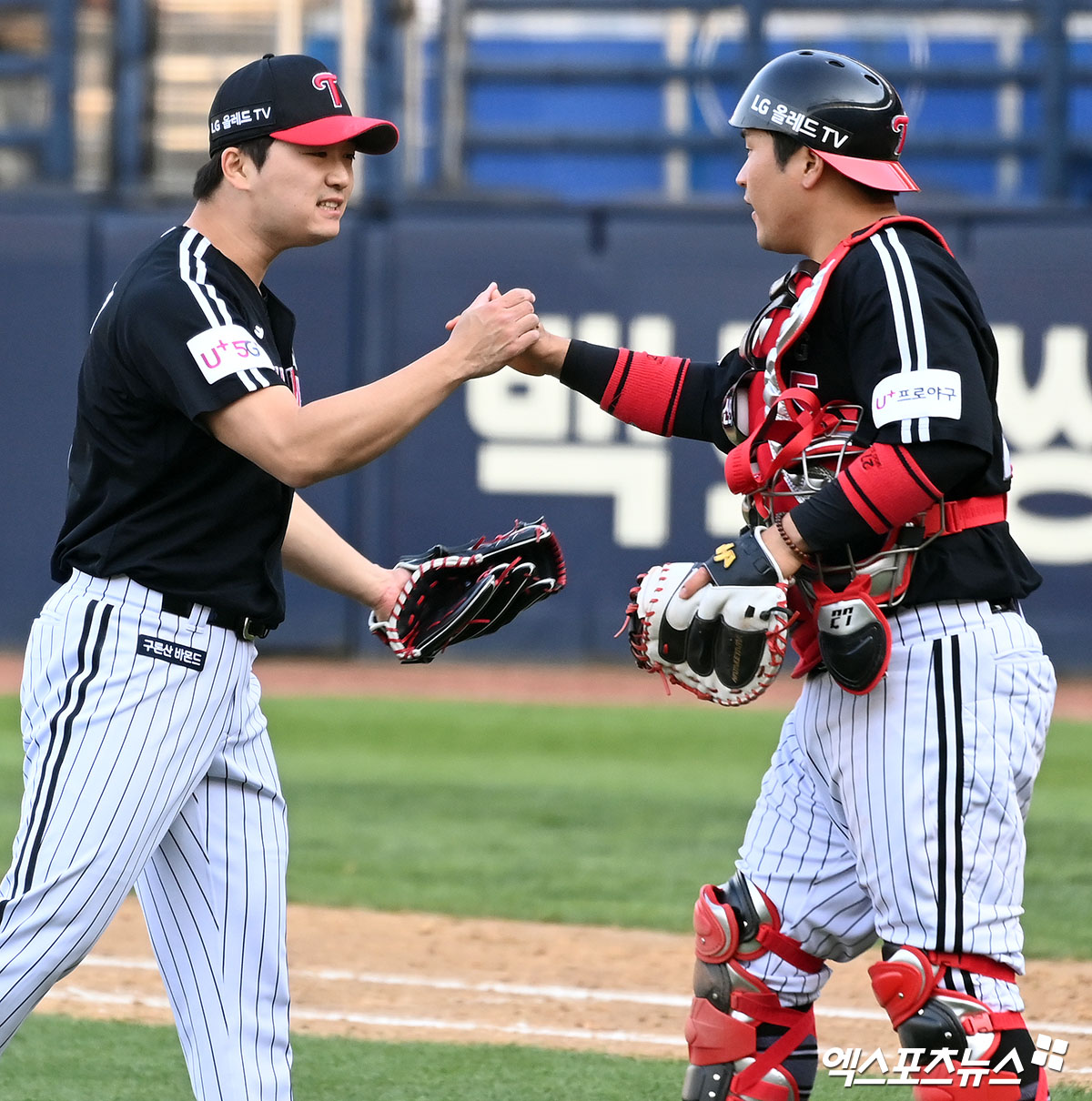 이날 경기에서 승리한 LG 고우석과 유강남이 기뻐하고 있다.
