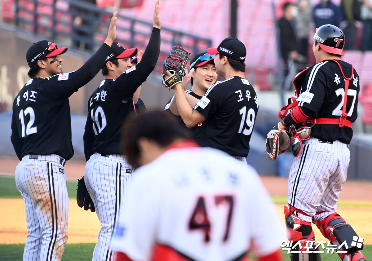 이날 경기에서 승리한 LG 선수들이 기뻐하고 있다.