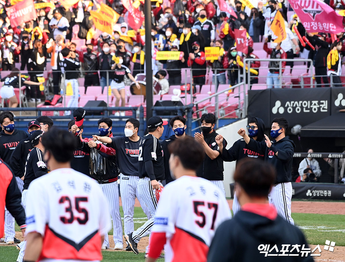 이날 경기에서 승리한 LG 선수들이 기뻐하고 있다.