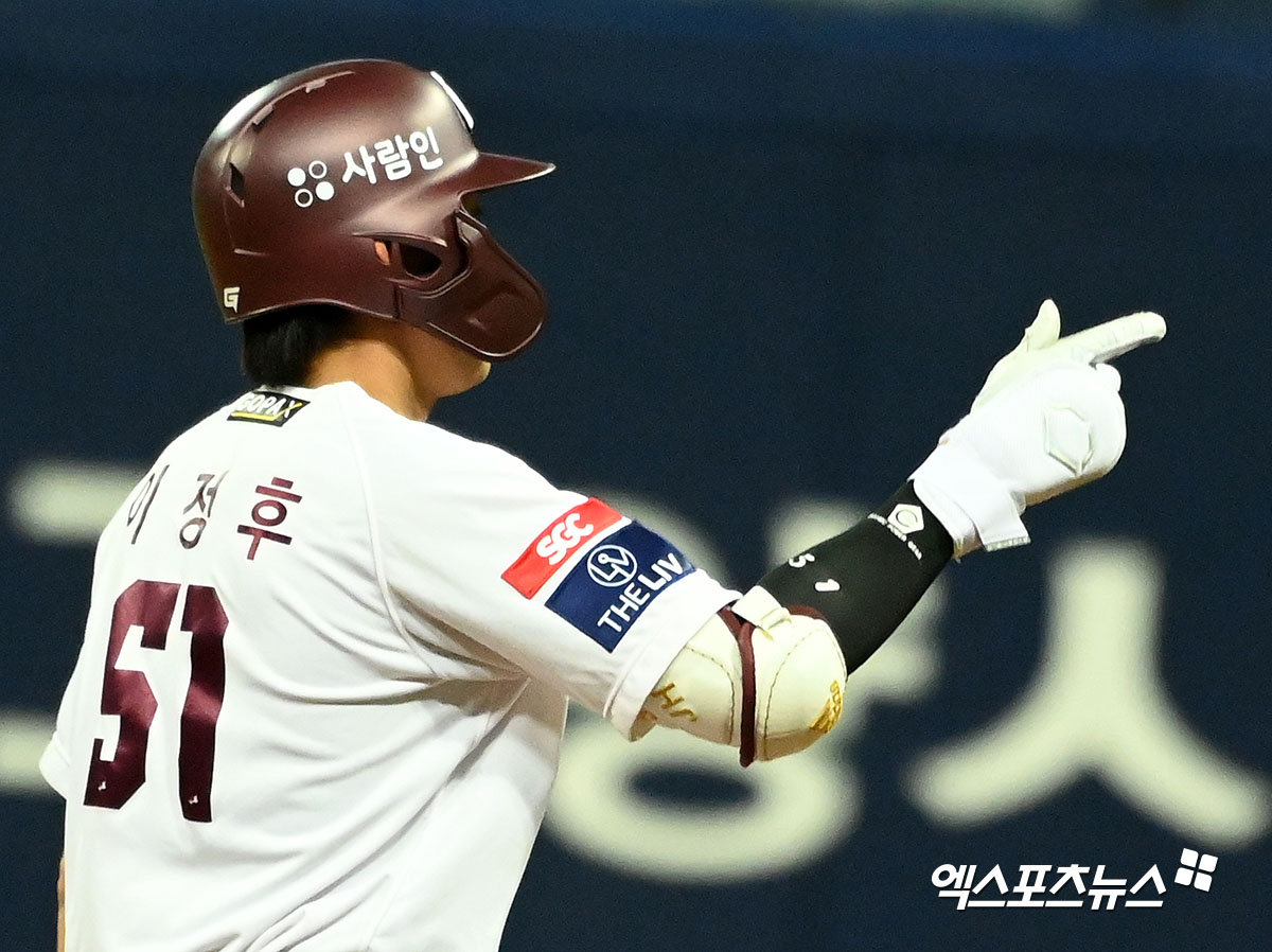 (엑스포츠뉴스 고척, 김한준 기자) 5일 오후 서울시 구로구 고척스카이돔에서 열린 ’2022 신한은행 SOL KBO리그’ LG 트위스와 키움 히어로즈의 경기, 1회말 1사 1루 키움 이정후가 2루타를 날린 후 세리머니를 하고 있다.
