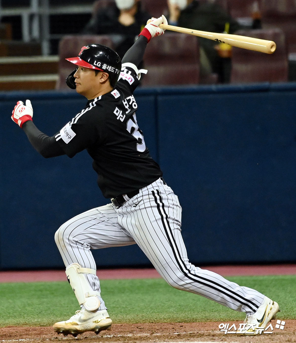 (엑스포츠뉴스 고척, 김한준 기자) 5일 오후 서울시 구로구 고척스카이돔에서 열린 ’2022 신한은행 SOL KBO리그’ LG 트위스와 키움 히어로즈의 경기, 8회초 LG 문보경이 우전안타를 날리고 있다.