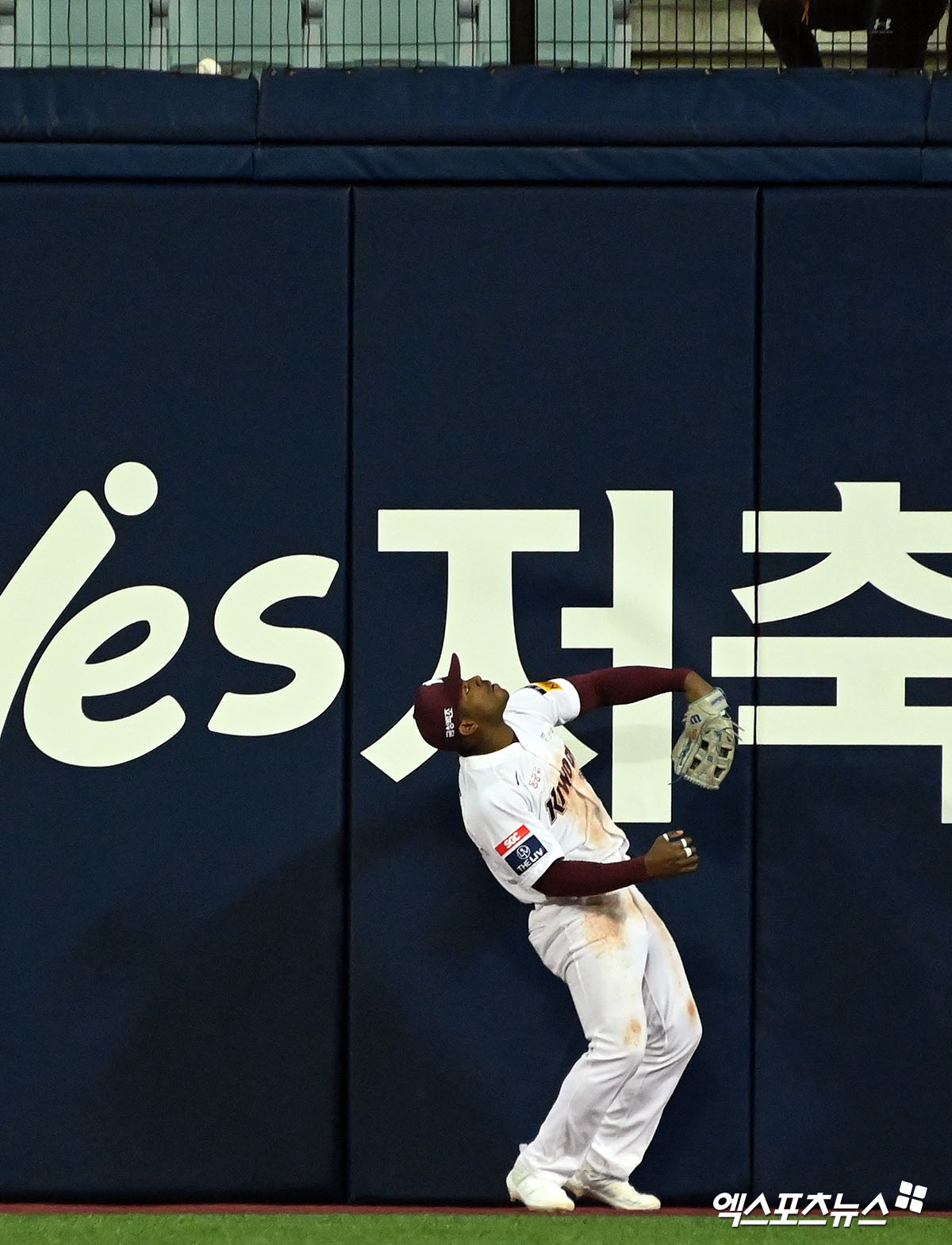 (엑스포츠뉴스 고척, 김한준 기자) 5일 오후 서울시 구로구 고척스카이돔에서 열린 ’2022 신한은행 SOL KBO리그’ LG 트위스와 키움 히어로즈의 경기, 9회초 2사 2,3루 키움 푸이그가 LG 김현수의 홈런 타구를 지켜보고 있다.