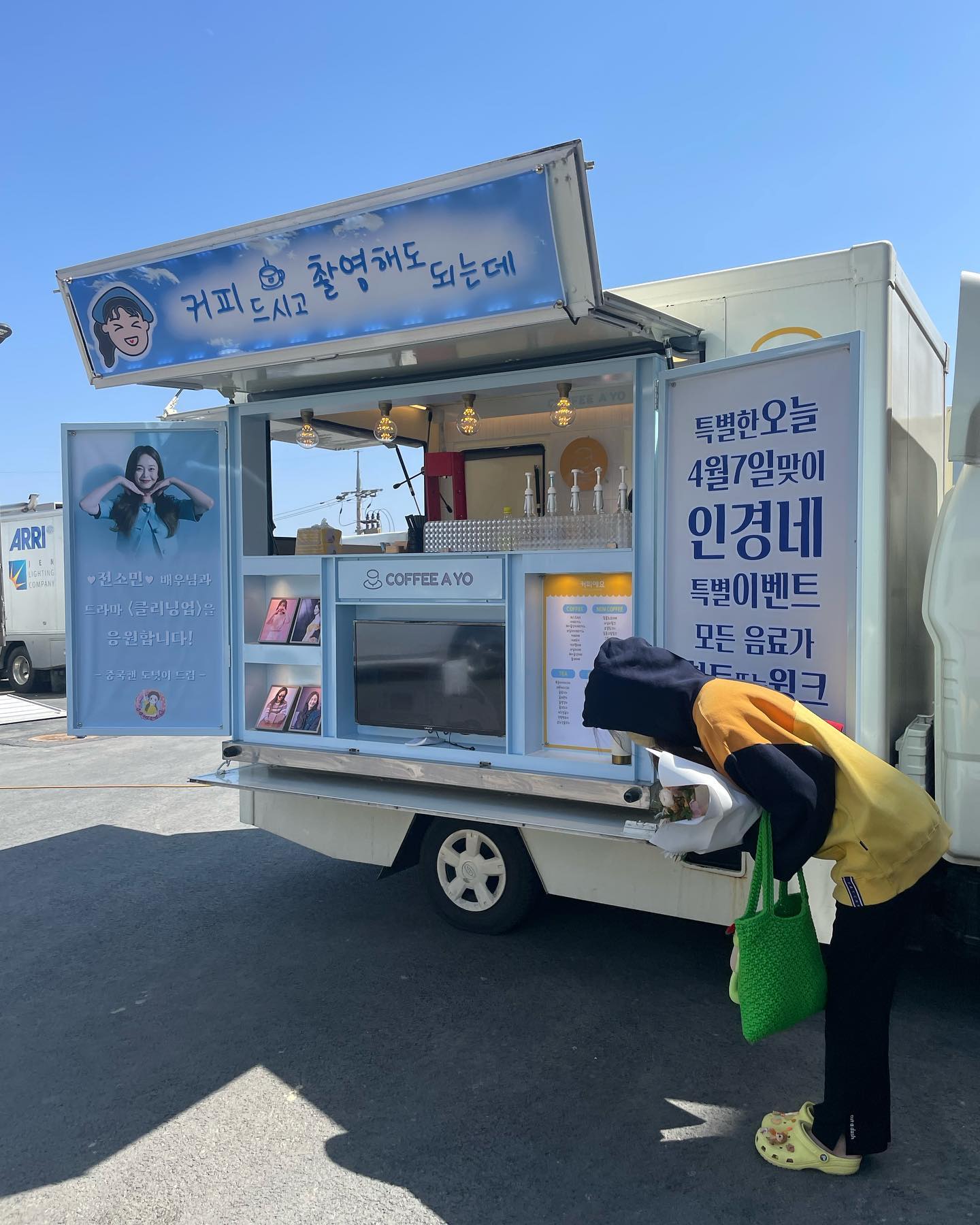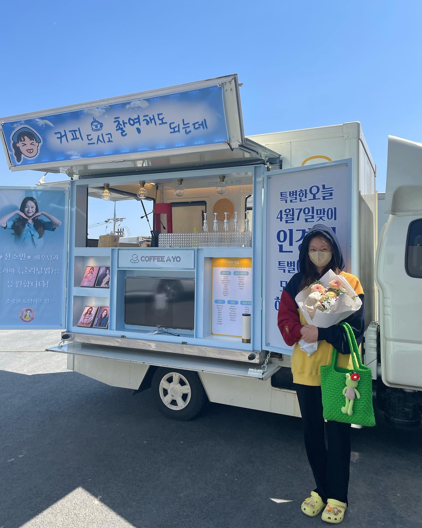 공개된 사진 속 전소민은 중국 팬들이 보낸 '전소민 배우님과 드라마 '클리닝 업'을 응원합니다!'라는 문구가 적힌 커피차 앞에서 허리를 숙여 인사하는 모습이다. 후드를 뒤집어쓴 채 꽃다발을 들고서 인증샷을 남기는 그의 모습이 시선을 모은다.