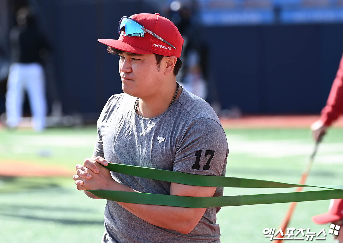 (엑스포츠뉴스 수원, 박지영 기자) 7일 오후 수원케이티위즈파크에서 열리는 '2022 신한은행 SOL KBO리그' SSG 랜더스와 KT 위즈의 경기에 앞서 SSG 추신수가 웜업 스트레칭을 하고 있다.