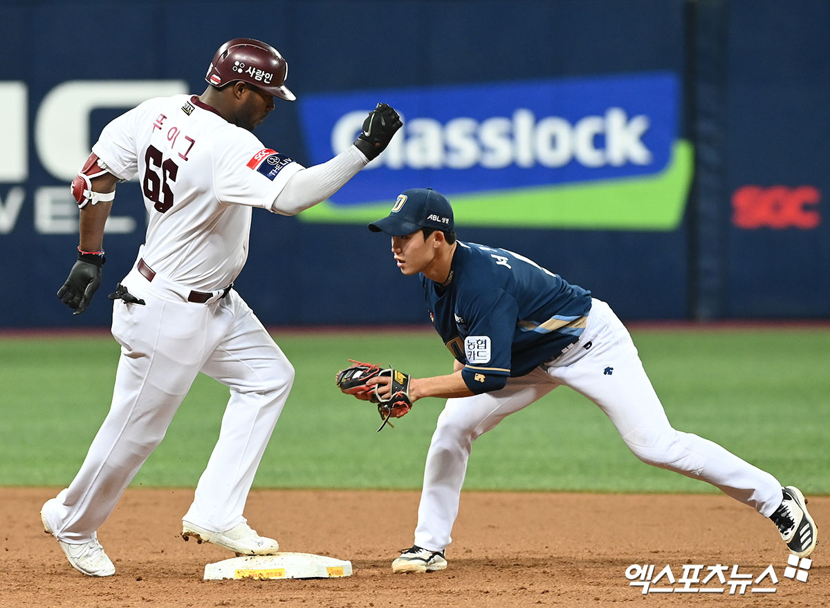 (엑스포츠뉴스 고척, 고아라 기자) 12일 오후 서울시 구로구 고척스카이돔에서 열린 ’2022 신한은행 SOL KBO리그’ NC 다이노스와 키움 히어로즈의 경기, 3회말 1사 키움 푸이그가 2루타를 날린 뒤 베이스를 밟고 있다.