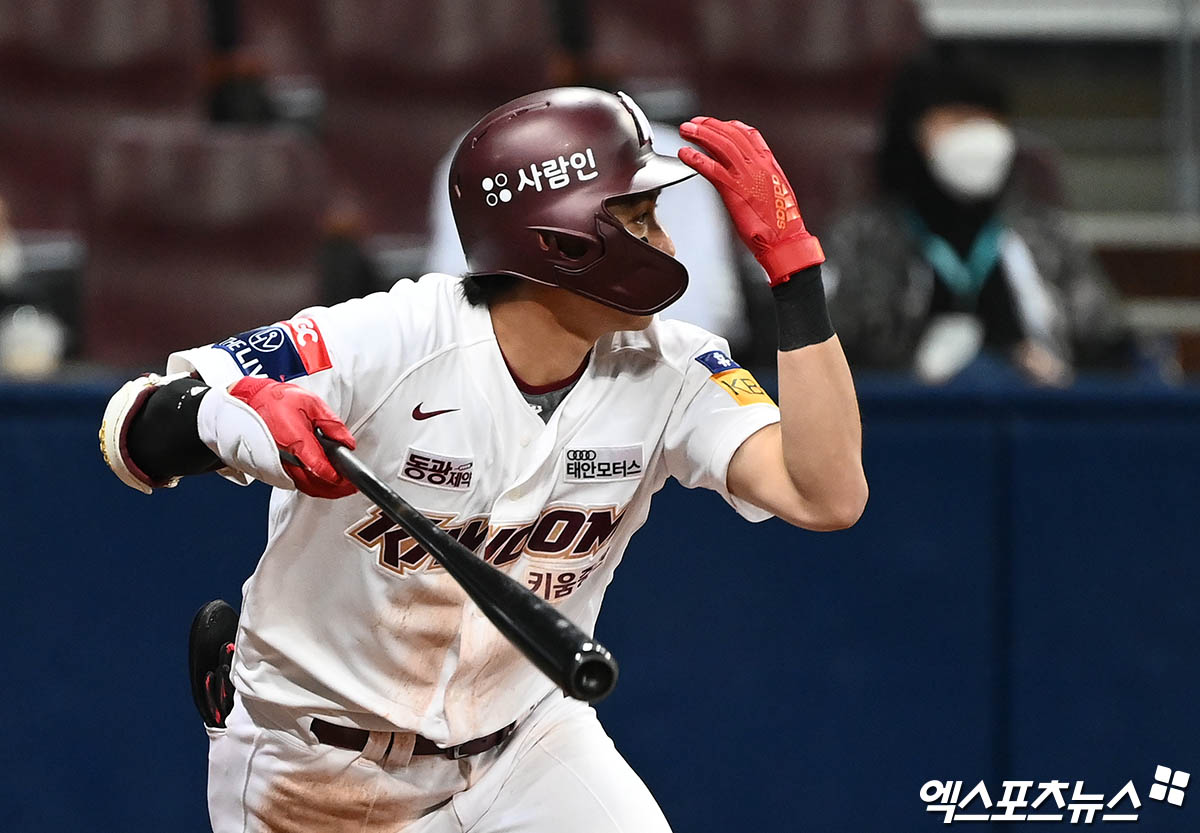 (엑스포츠뉴스 고척, 박지영 기자) 13일 오후 서울 구로구 고척스카이돔에서 열린 '2022 신한은행 SOL KBO리그' NC 다이노스와 키움 히어로즈의 경기, 9회말 2사 키움 이정후가 안타를 때려내고 있다.