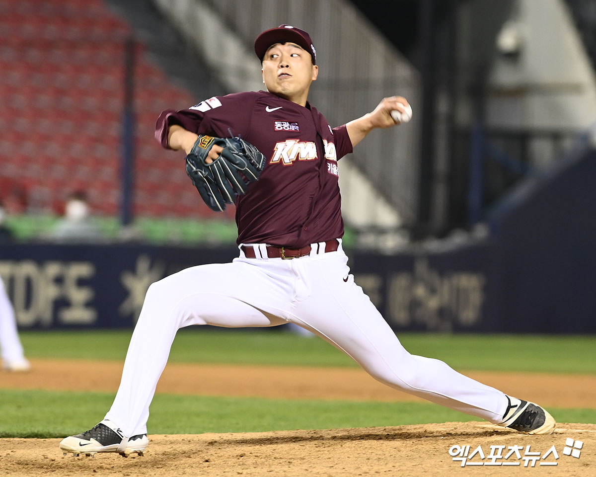 (엑스포츠뉴스 잠실, 고아라 기자) 15일 오후 서울 송파구 잠실야구장에서 열린 '2022 신한은행 KBO리그' 키움 히어로즈와 두산 베어스의 경기, 7회말 키움 이승호가 공을 힘차게 던지고 있다.