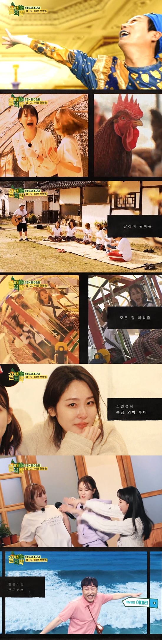 공개된 티저 영상에서는 이수근X이진호X규현의 차차차 댄스와 함께 첫 게스트로 출격하는 ‘FC 아나콘다’ 멤버들의 소원 성취 여행 모습이 담겨있어 호기심을 자극한다. ‘FC 아나콘다’ 멤버들은 마당에 둘러앉아 흥겹게 노래를 부르며 레크리에이션을 즐기고, 마이크를 잡고 흥 넘치는 춤사위를 선보이는 한편, 닭장 안에서 혼비백산하거나 다람쥐통 놀이기구를 타며 고함을 지르는 등 ‘골 때리는 그녀들’에서의 전패를 씻어내는 한풀이 여행을 제대로 즐기는 모습을 보였다.
