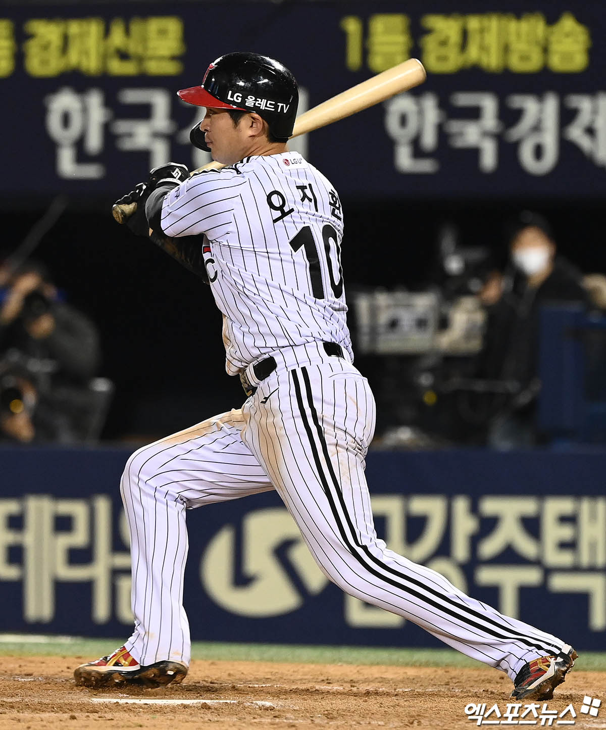 (엑스포츠뉴스 잠실, 박지영 기자) 21일 오후 서울 송파구 잠실야구장에서 열린 '2022 신한은행 SOL KBO리그' KT 위즈와 LG 트윈스의 경기, 5회말 무사 LG 선두타자 오지환이 안타를 때려내고 있다.
