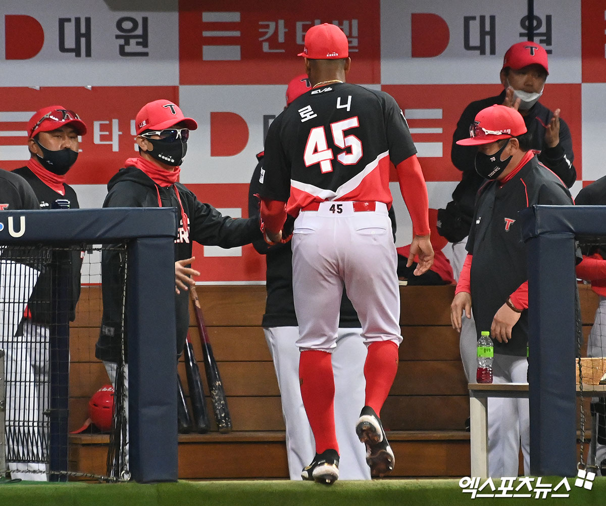 (엑스포츠뉴스 고척, 김한준 기자) 22일 오후 서울시 구로구 고척스카이돔에서 열린 ’2022 신한은행 SOL KBO리그’ KIA 타이거즈와 키움 히어로즈의 경기, 6회말 1사 1루 키움 선발투수 로니가 마운드를 내려가고 있다.
