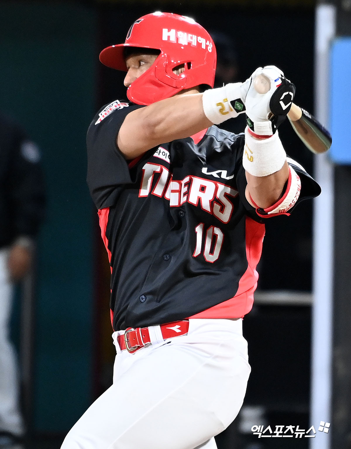 (엑스포츠뉴스 수원, 김한준 기자) 26일 오후 수원 KT위즈파크에서 열린 ’2022 신한은행 SOL KBO리그’ KIA 타이거즈와 KT 위즈의 경기, 5회초 1사 KIA 박동원이 우전안타를 날리고 있다.