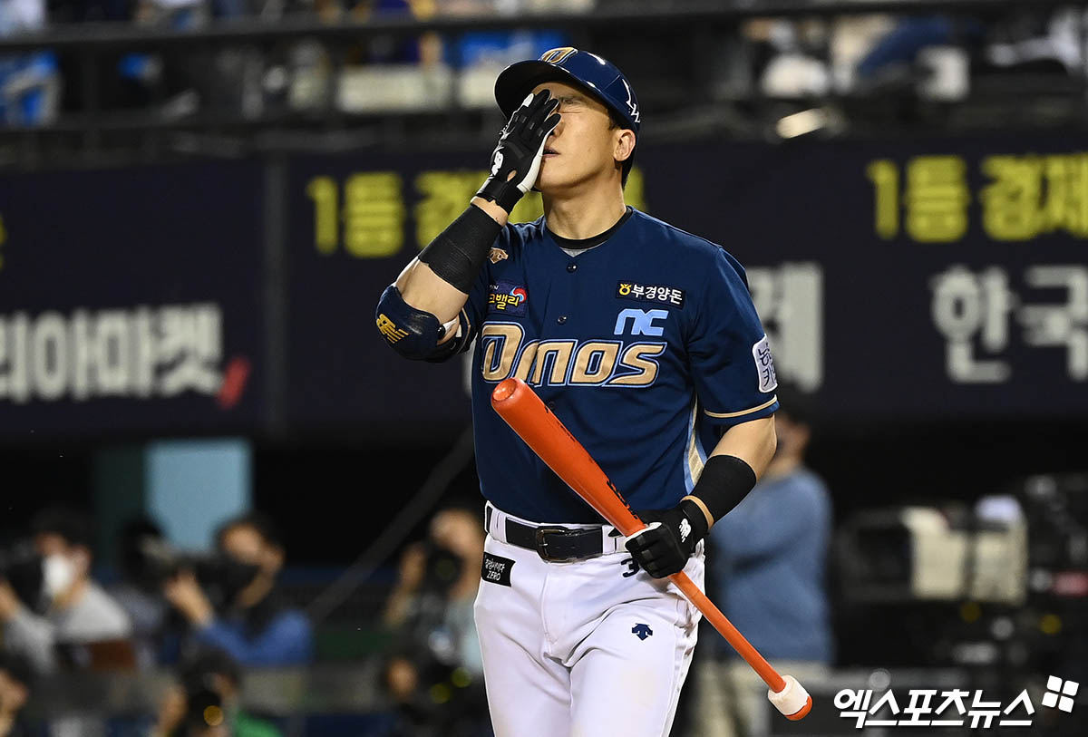 (엑스포츠뉴스 잠실, 박지영 기자) 26일 오후 서울 송파구 잠실야구장에서 열린 '2022 신한은행 SOL KBO리그' NC 다이노스와 두산 베어스의 경기, 5회초 2사 1루 NC 손아섭이 헛스윙 삼진 아웃으로 물러나며 아쉬워하고 있다.