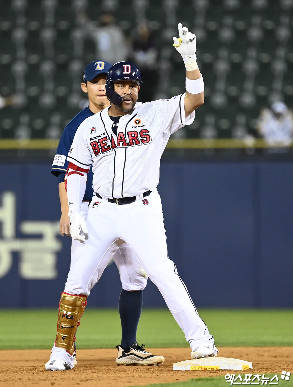 (엑스포츠뉴스 잠실, 박지영 기자) 26일 오후 서울 송파구 잠실야구장에서 열린 '2022 신한은행 SOL KBO리그' NC 다이노스와 두산 베어스의 경기, 8회말 2사 두산 페르난데스가 2루타를 때려낸 뒤 세리머니를 하고 있다.