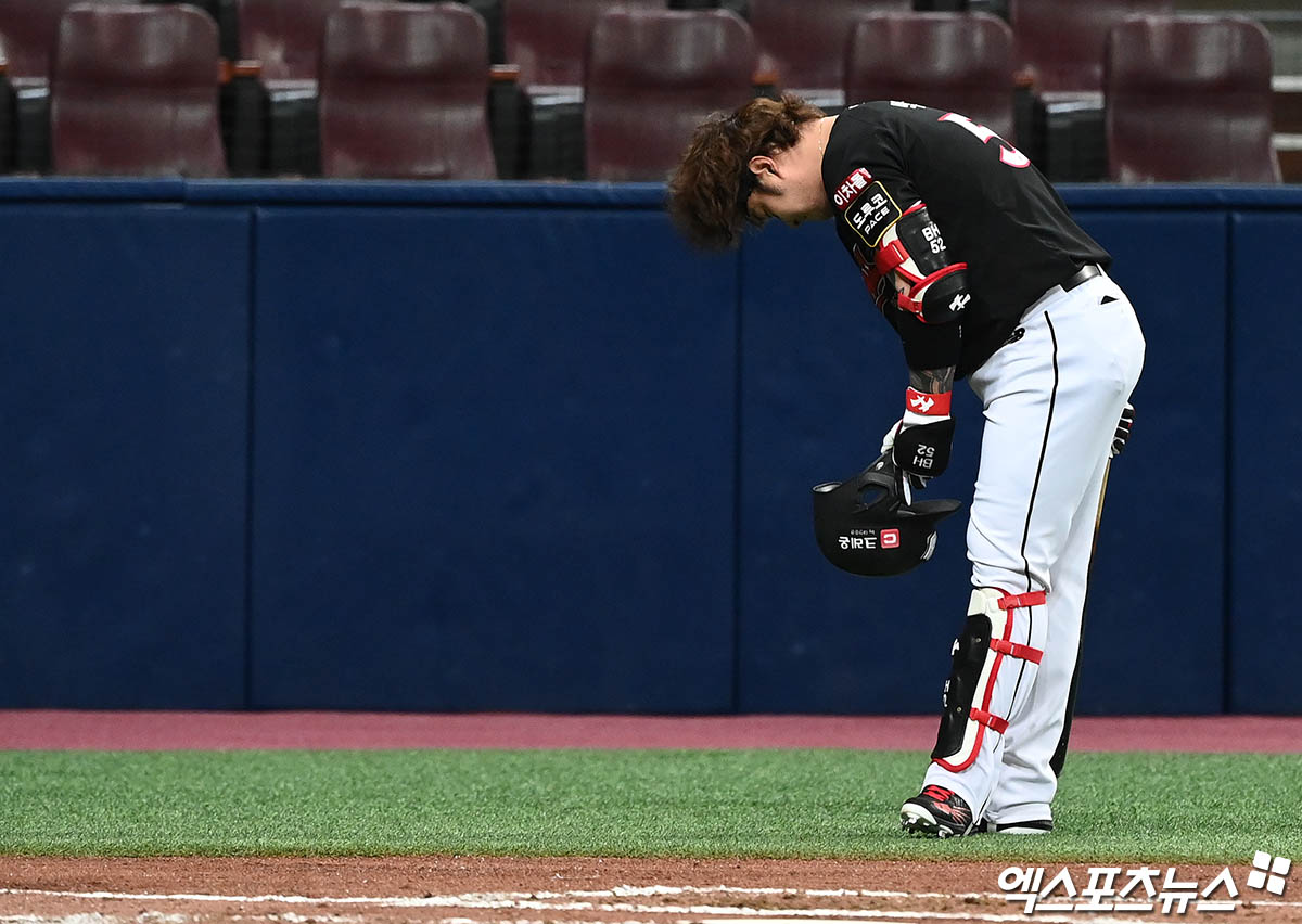 (엑스포츠뉴스 고척, 박지영 기자) 29일 오후 서울 구로구 고척스카이돔에서 열린 '2022 신한은행 SOL KBO리그' KT 위즈와 키움 히어로즈의 경기, 2회초 무사 KT 선두타자 박병호가 타석에 들어서기 전 1루 관중석의 키움 팬들을 향해 인사하고 있다.
