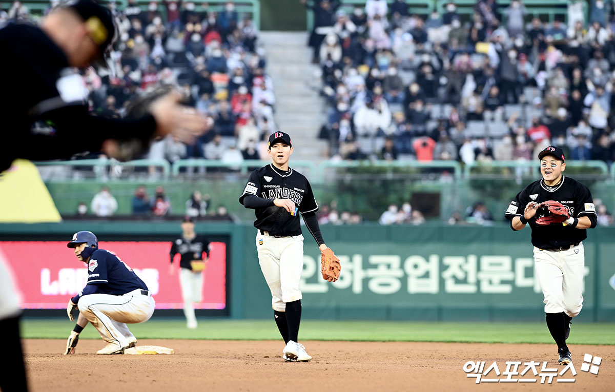 (엑스포츠뉴스 인천, 고아라 기자) 30일 오후 인천 SSG랜더스필드에서 열린 ’2022 신한은행 SOL KBO리그’ 두산 베어스와 SSG 랜더스의 경기, 5회초 1사 만루 SSG 박성한, 최주환이 실점 없이 수비를 마무리한 뒤 기뻐하고 있다.