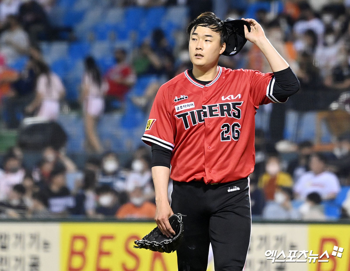(엑스포츠뉴스 대전, 김한준 기자) 6일 오후 대전 한화생명 이글스파크에서 열린 ’2022 신한은행 SOL KBO리그’ KIA 타이거즈와 한화 이글스의 경기, 5회말 수비를 마친 KIA 선발투수 한승혁이 더그아웃으로 향하고 있다.
