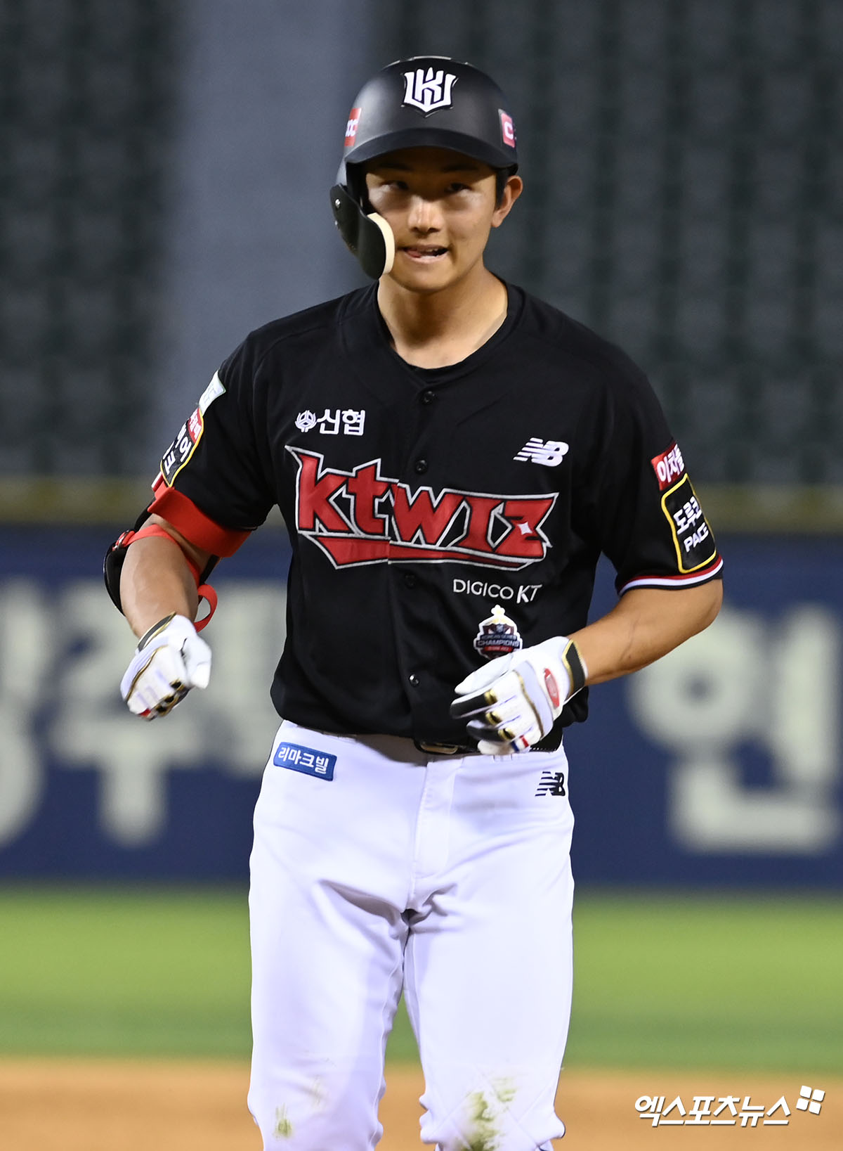 (엑스포츠뉴스 잠실, 고아라 기자) 7일 오후 서울 송파구 잠실야구장에서 열린 '2022 신한은행 SOL KBO리그' KT 위즈와 두산 베어스의 경기, 9회초 2사 2루 KT 전진영이 1타점 적시타를 날린 뒤 1루 베이스를 밟고 있다.