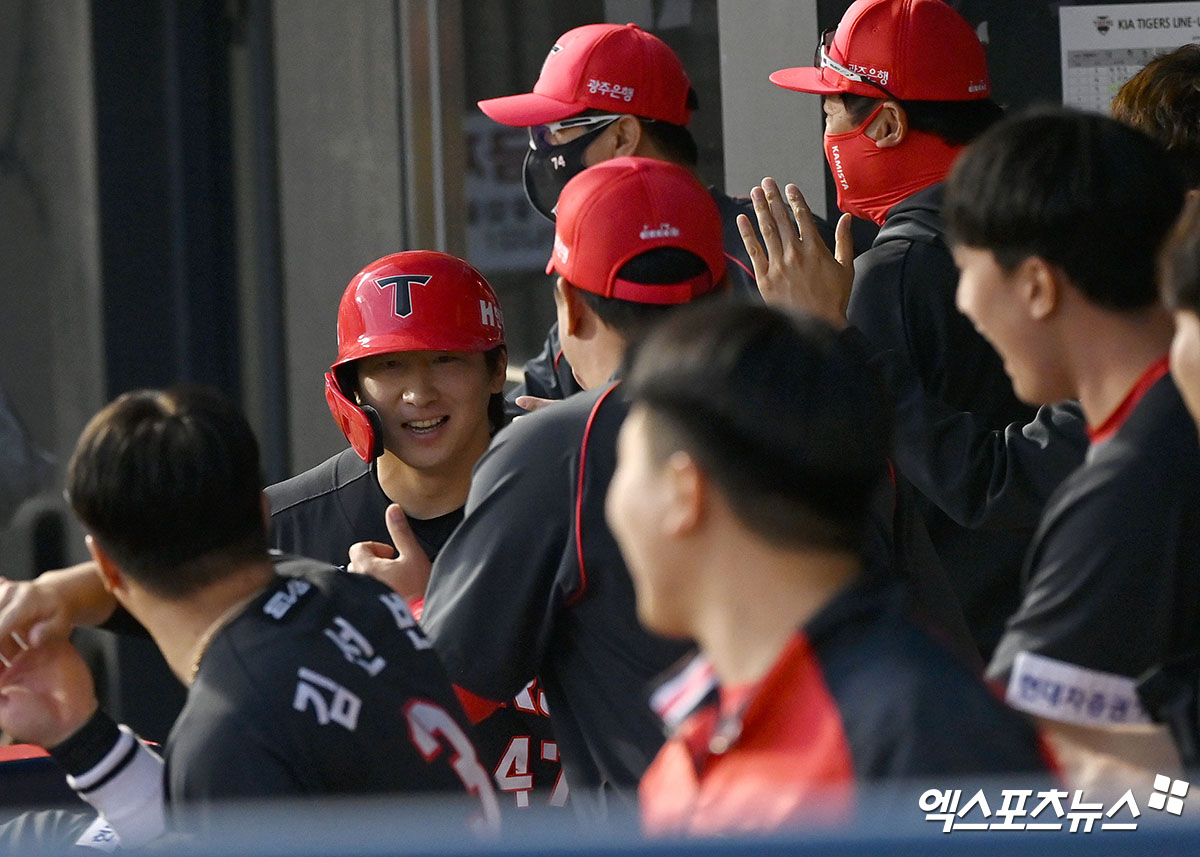(엑스포츠뉴스 잠실, 김한준 기자) 13일 오후 서울 송파구 잠실야구장에서 열린 '2022 신한은행 SOL KBO리그' KIA 타이거즈와 LG 트윈스의 경기, 3회초 1사 만루 KIA 나성범이 최형우의 2타점 2루타때 득점에 성공한 후 더그아웃에서 축하를 받고 있다.