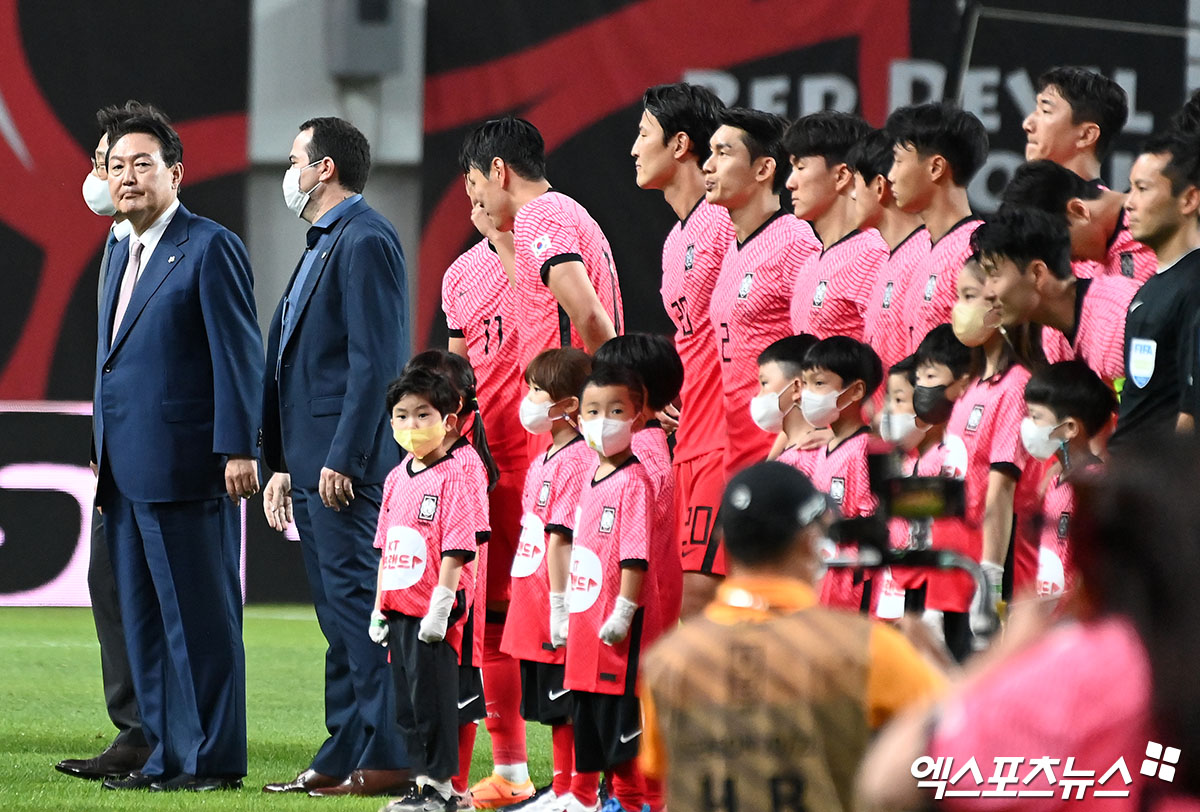 (엑스포츠뉴스 서울월드컵경기장, 김한준 기자) 2일 오후 서울 성산동 서울월드컵경기장에서 열린 ‘하나은행 초청 축구 국가대표팀 친선경기’ 대한민국과 브라질의 경기, 경기 전 윤석열 대통령이 선수단을 격려하고 있다.