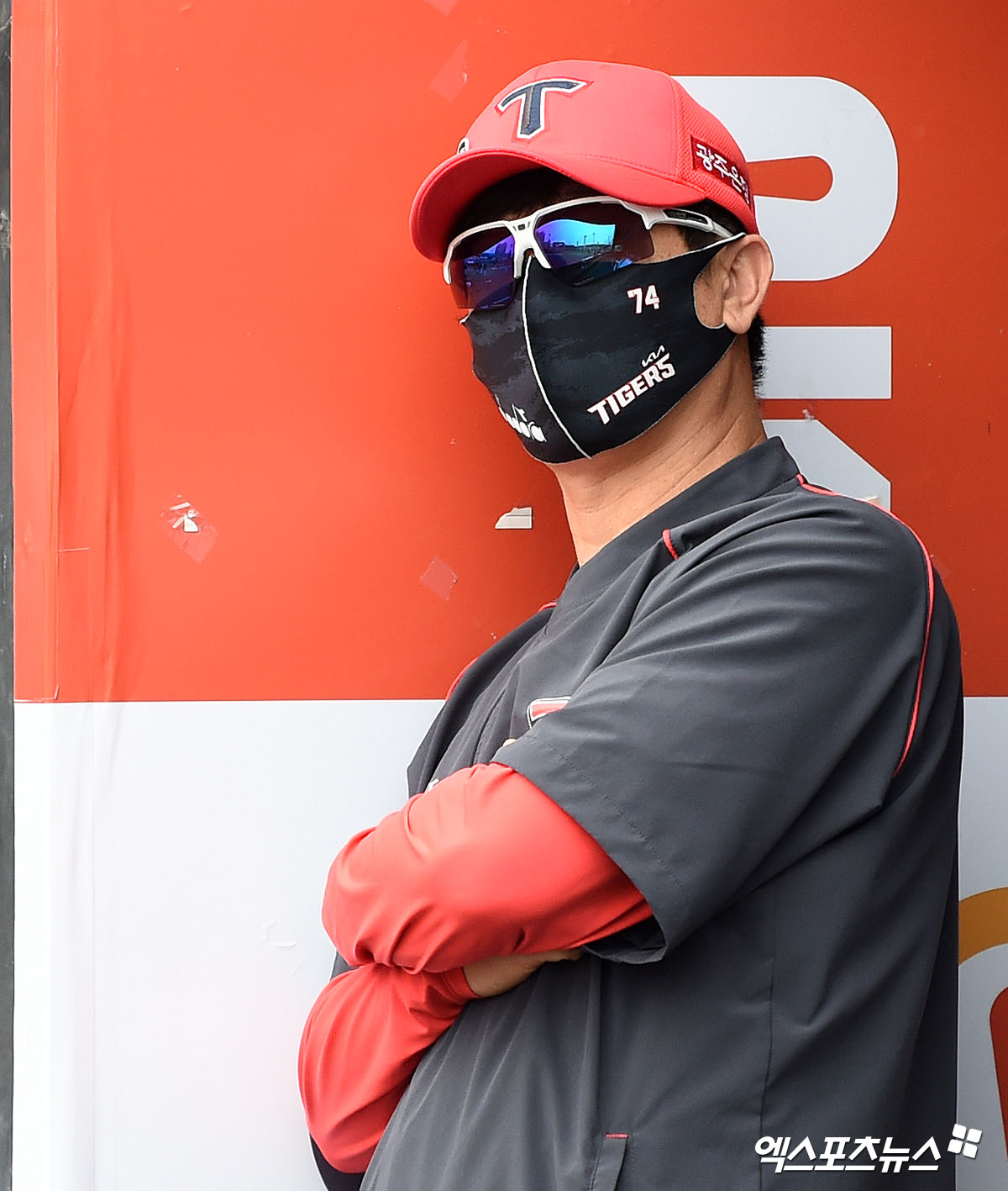 (엑스포츠뉴스 수원, 김한준 기자) 4일 오후 수원 KT위즈파크에서 열리는 ’2022 신한은행 SOL KBO리그’ KIA 타이거즈와 KT 위즈의 경기, KIA 김종국 감독이 선수들의 훈련을 지켜보고 있다.