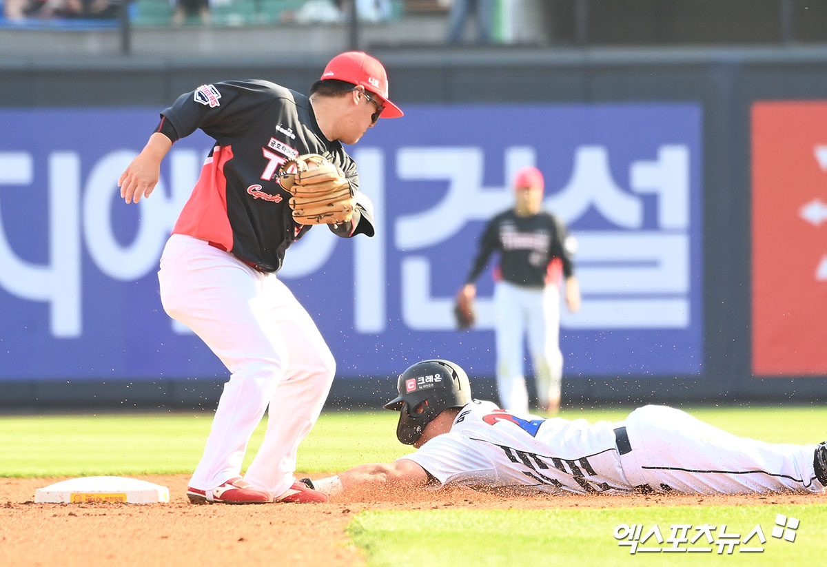 (엑스포츠뉴스 수원, 김한준 기자) 4일 오후 수원 KT위즈파크에서 열린 ’2022 신한은행 SOL KBO리그’ KIA 타이거즈와 KT 위즈의 경기, 2회말 2사 1루 KT 배정대가 2루 도루를 시도하고 있다.