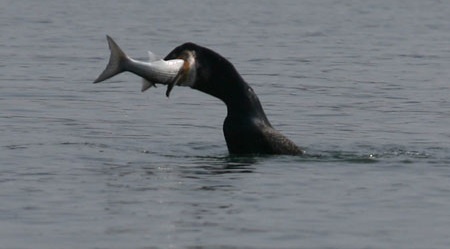 영국에서 자신의 몸집만한 숭어를 잡아먹는 가마우지가 포착된 것.