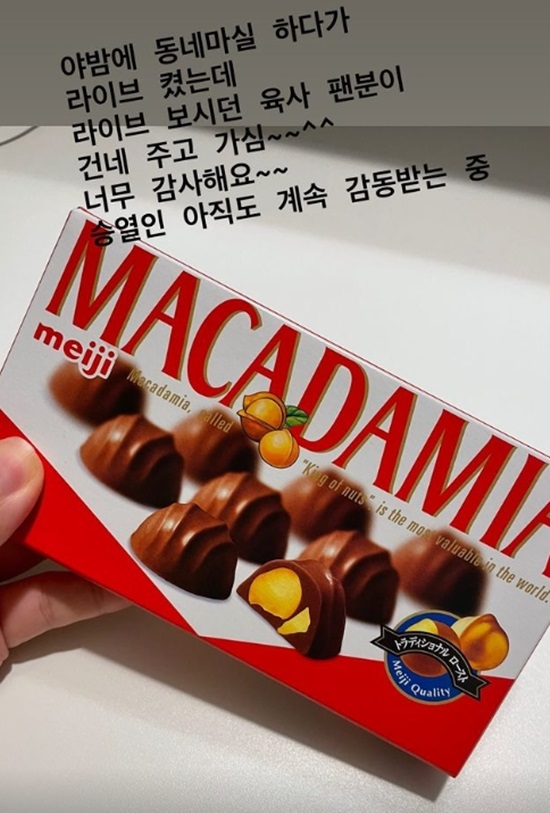 이어 김영희는 "야밤에 동네 마실 하다가 라이브 켰는데 라이브 보시던 육사 팬분이 건네주고 가심 너무 감사해요 승열인 아직도 계속 감동받는 중"이라며 초콜릿 사진을 공개했다. 팬에게 받은 선물을 인증하며 행복한 일상을 공유했다.