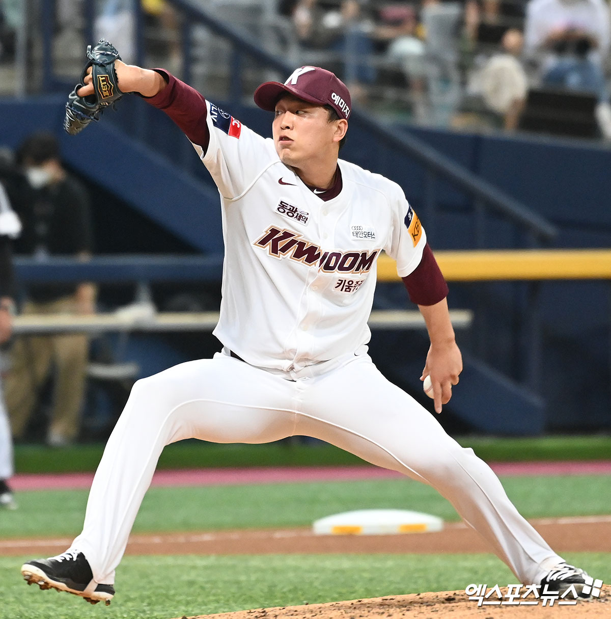 (엑스포츠뉴스 고척, 김한준 기자) 17일 오후 서울시 구로구 고척스카이돔에서 열린 ’2022 신한은행 SOL KBO리그’ LG 트위스와 키움 히어로즈의 경기, 6회초 키움 이승호가 공을 힘차게 던지고 있다.