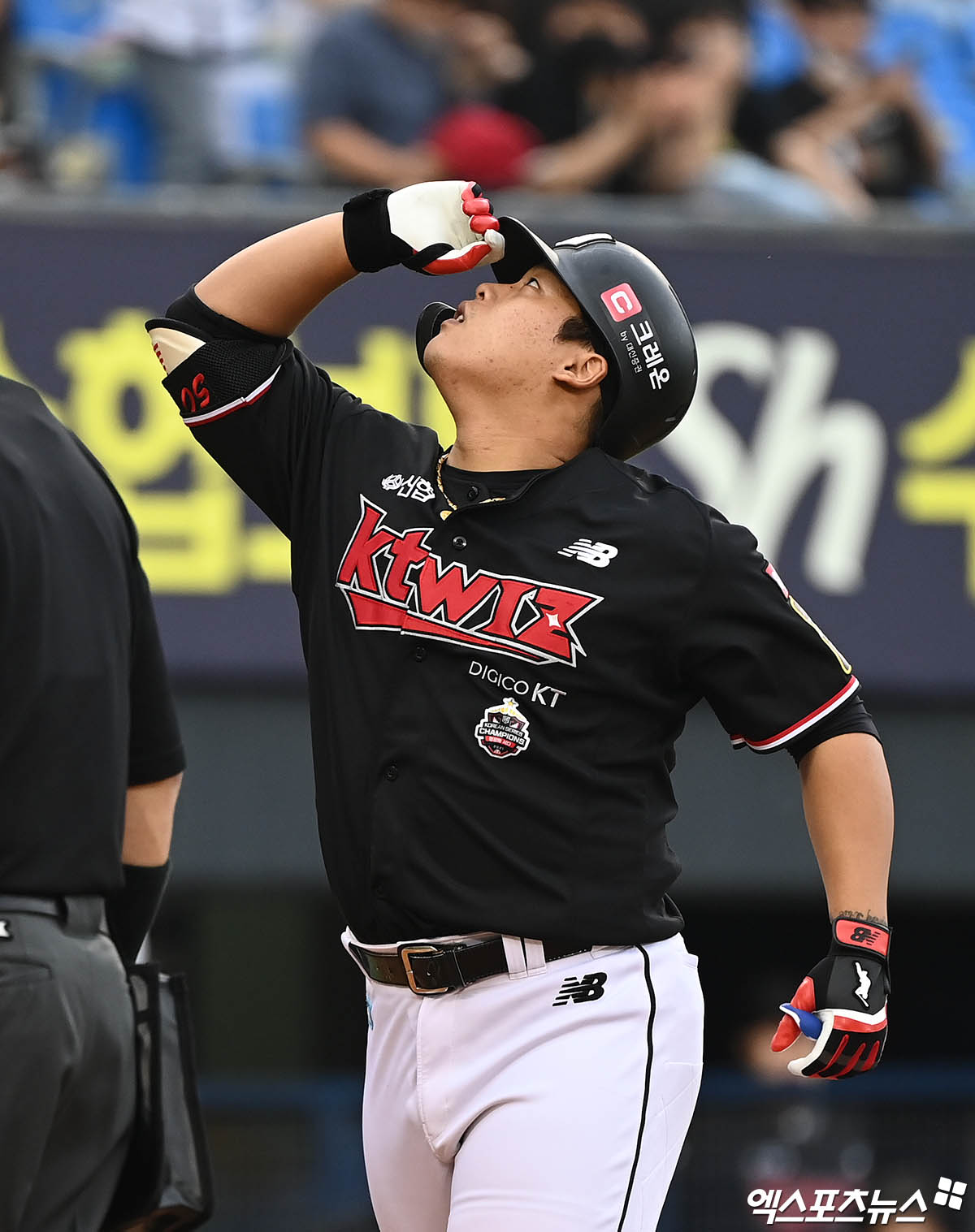 (엑스포츠뉴스 잠실, 박지영 기자) 19일 오후 서울 송파구 잠실야구장에서 열린 '2022 신한은행 SOL KBO리그' KT 위즈와 두산 베어스의 경기, 3회초 2사 1루 KT 강백호가 두산 선발투수 최원준 상대로 투런 홈런을 때려낸 뒤 세리머니를 하고 있다.