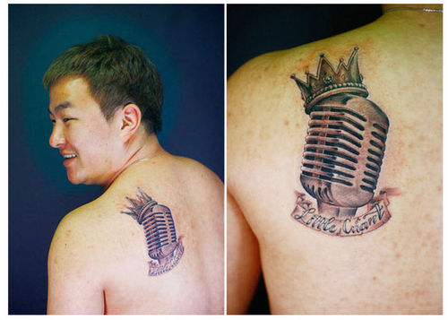 허각의 등 뒤에 그려진 이 문신은 마이크가 왕관을 쓰고 있는 모양으로 마이크와 왕관이 디테일하게 그려져 있다.