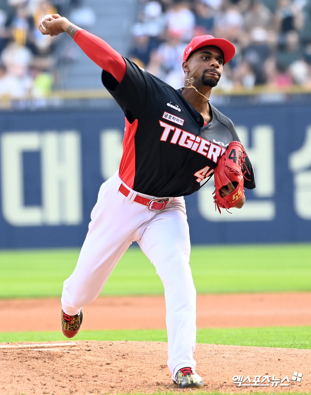 (엑스포츠뉴스 잠실, 김한준 기자) 25일 오후 서울 송파구 잠실야구장에서 열린 '2022 신한은행 SOL KBO리그' KIA 타이거즈와 두산 베어스의 경기, 1회말 KIA 선발투수 로니가 공을 힘차게 던지고 있다.