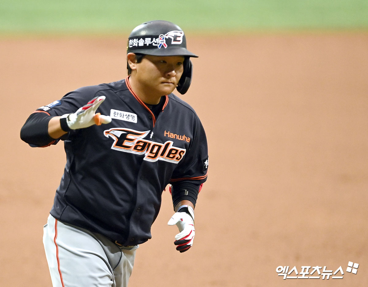 (엑스포츠뉴스 고척, 김한준 기자) 3일 오후 서울시 구로구 고척스카이돔에서 열린 ’2022 신한은행 SOL KBO리그’ 한화 이글스와 키움 히어로즈의 경기, 1회초 1사 한화 김태연이 솔로 홈런을 날린 후 그라운드를 돌고 있다.