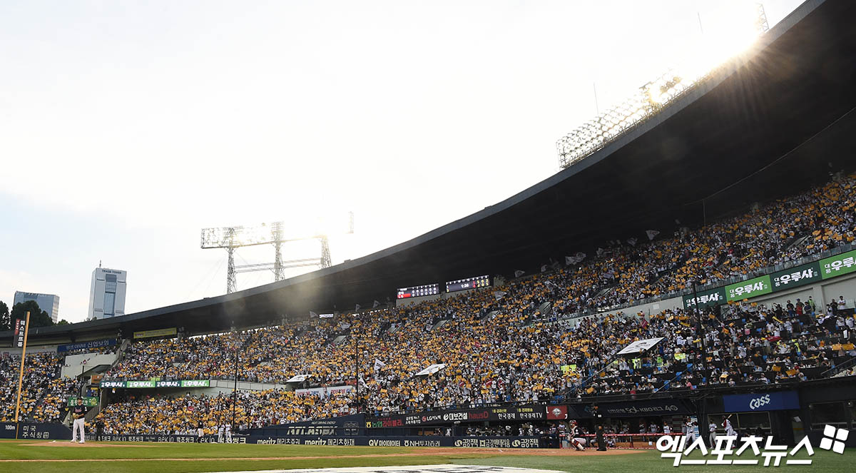 (엑스포츠뉴스 잠실, 박지영 기자) 3일 오후 서울 송파구 잠실야구장에서 열린 '2022 신한은행 SOL KBO리그' 롯데 자이언츠와 LG 트윈스의 경기, 만원 관중이 들어찬 가운데 LG 팬들이 열띤 응원을 펼치고 있다.