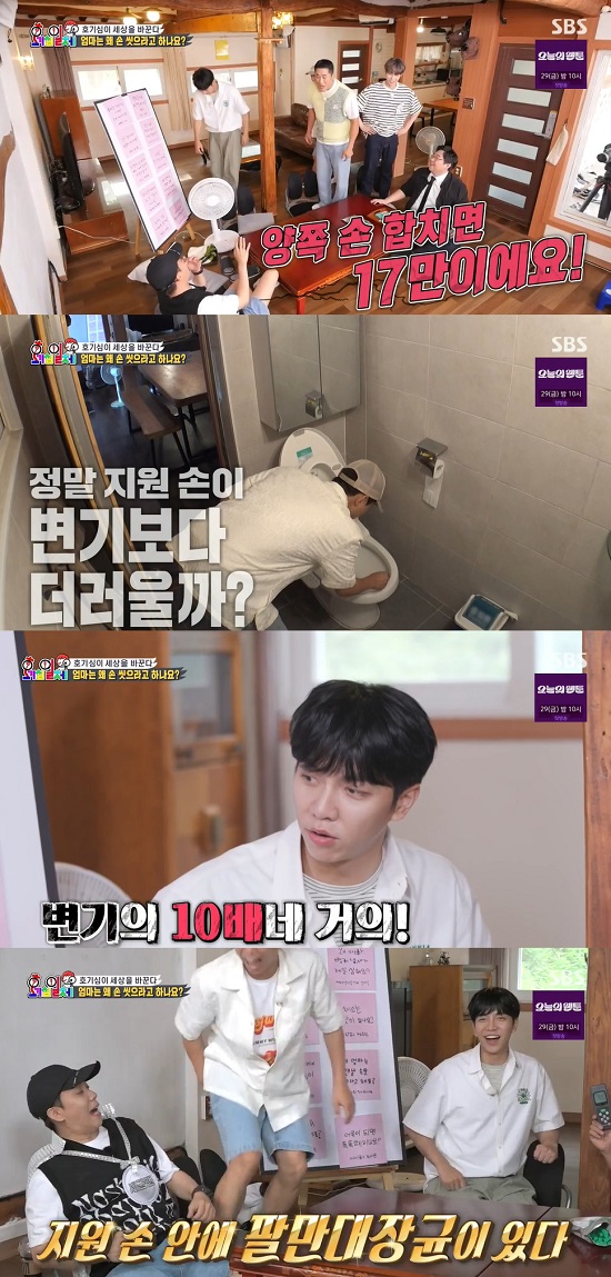 양세형은 "변기의 수치도 궁금하다"며 손수 변기의 오염도를 재고 왔다. 측정된 변기 속 세균 오염도는 9000대, 은지원은 변기의 약 10배 수준의 오염도를 자랑한 셈이 됐다.