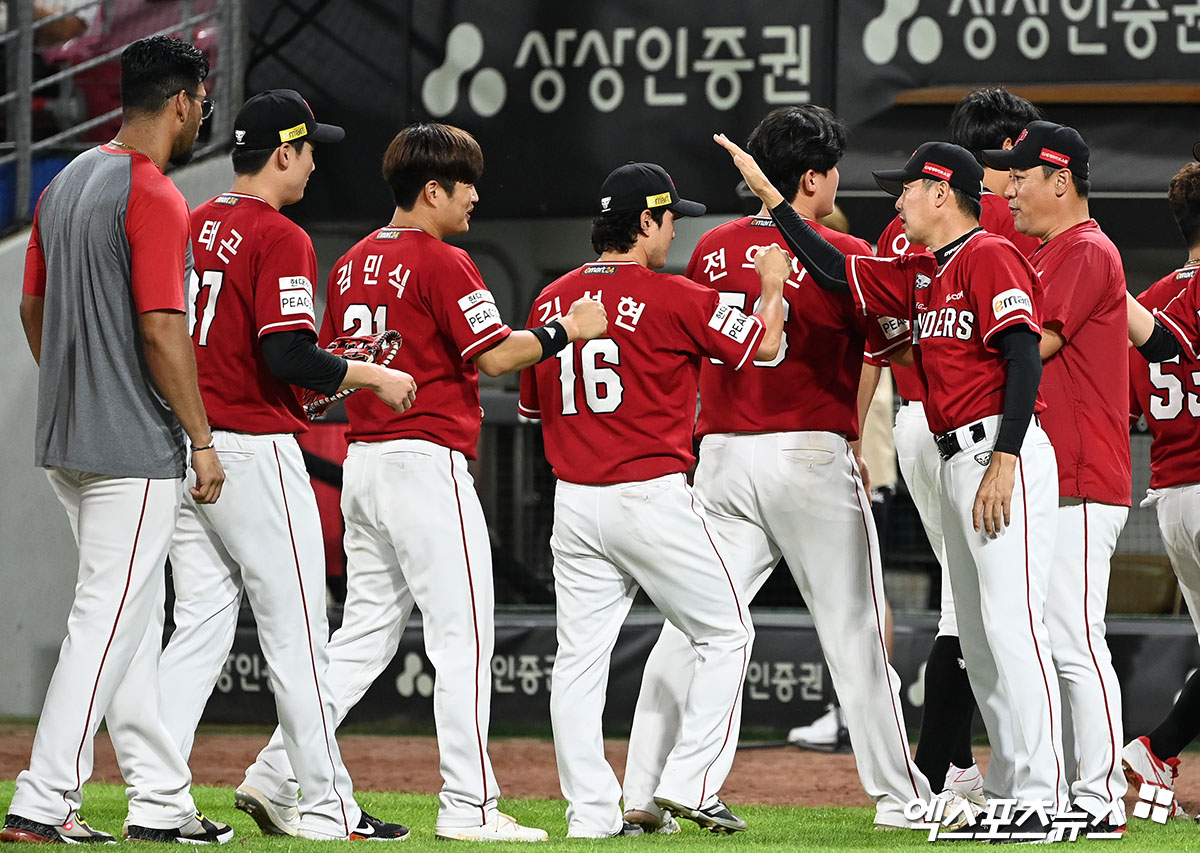경기종료 후 SSG 김원형 감독이 선수들과 함께 기뻐하고 있다.