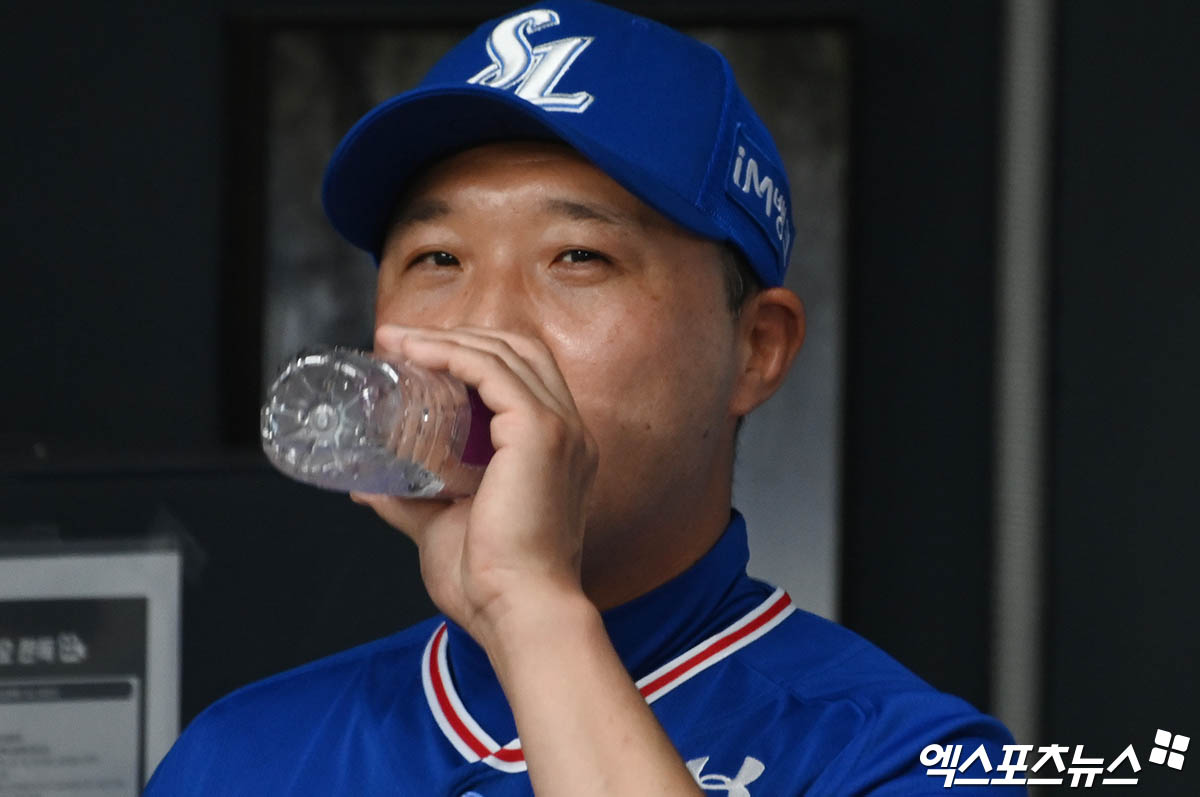 (엑스포츠뉴스 잠실, 박지영 기자) 3일 오후 서울 송파구 잠실야구장에서 열린 '2022 신한은행 SOL KBO리그' 삼성 라이온즈와 두산 베어스의 경기, 삼성 박진만 감독대행이 더그아웃에서 경기를 지켜보며 물을 마시고 있다.