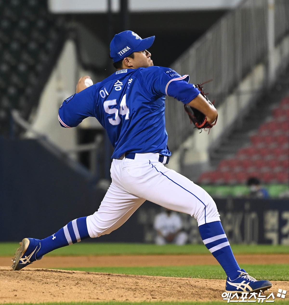 (엑스포츠뉴스 잠실, 박지영 기자) 3일 오후 서울 송파구 잠실야구장에서 열린 '2022 신한은행 SOL KBO리그' 삼성 라이온즈와 두산 베어스의 경기, 8회말 삼성 이승현이 역투하고 있다.
