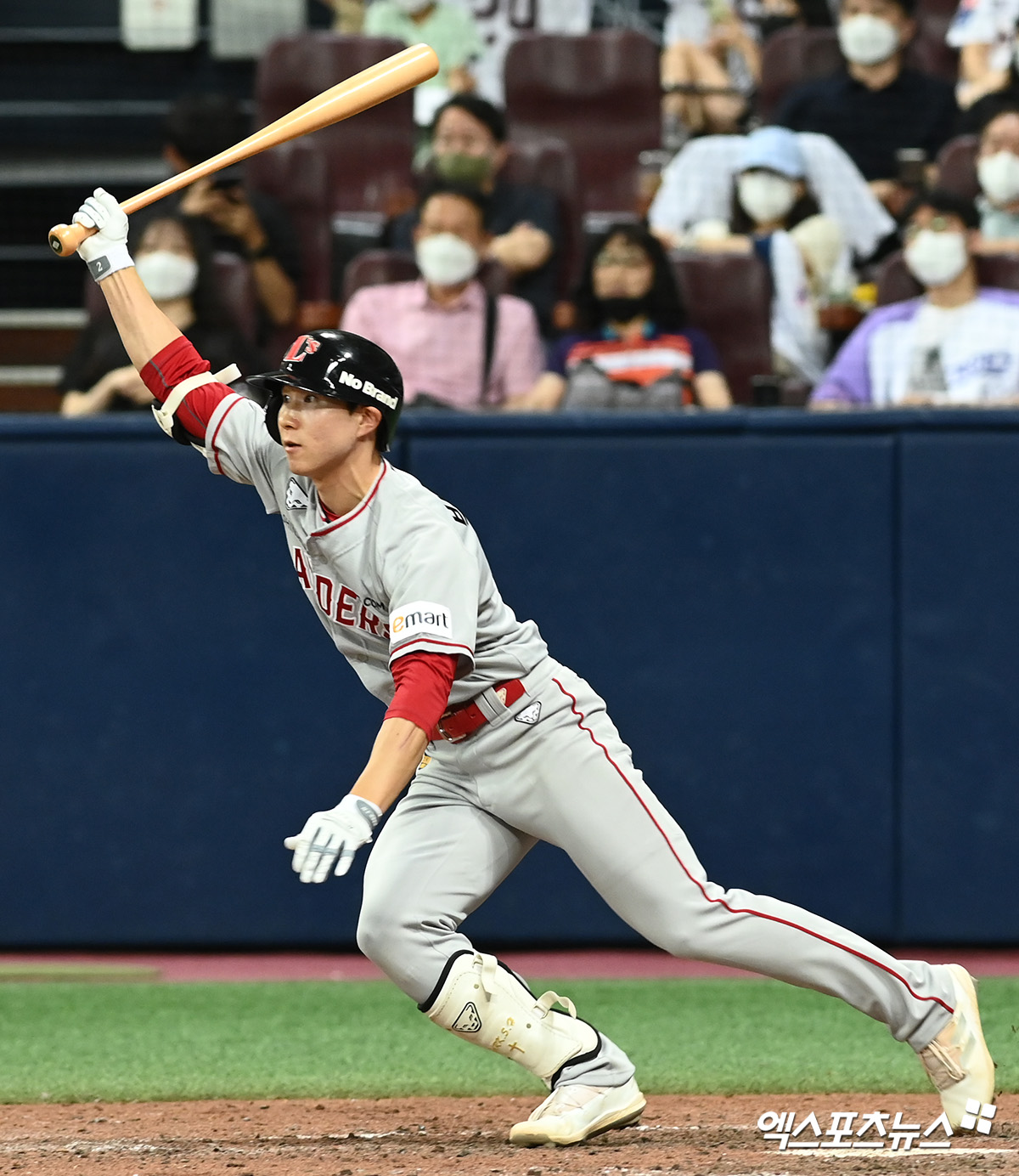 (엑스포츠뉴스 고척, 고아라 기자) 4일 오후 서울시 구로구 고척스카이돔에서 열린 ’2022 신한은행 SOL KBO리그’ SSG 랜더스와 키움 히어로즈의 경기, 10회초 무사 1,3루 SSG 박성한이 1타점 내야땅볼 타구를 날리고 있다.