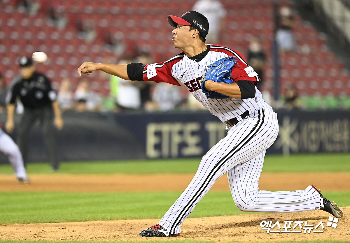 (엑스포츠뉴스 잠실, 김한준 기자) 21일 오후 서울 송파구 잠실야구장에서 열린 '2022 신한은행 SOL KBO리그' 두산 베어스와 LG 트윈스의 경기, 8회초 LG 정우영이 공을 힘차게 던지고 있다.
