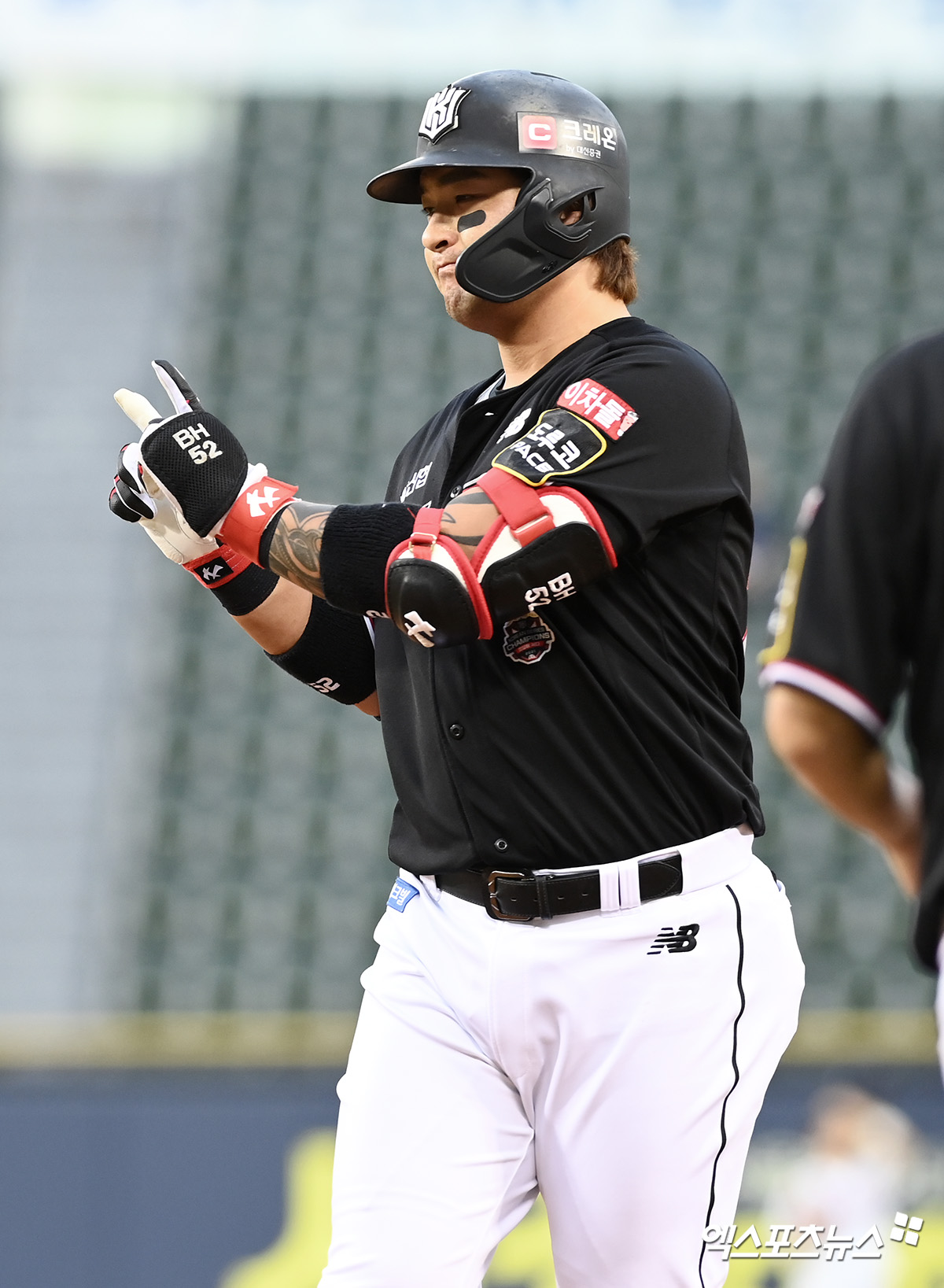 (엑스포츠뉴스 잠실, 고아라 기자) 24일 오후 서울 송파구 잠실야구장에서 열린 '2022 신한은행 SOL KBO리그' KT 위즈와 두산 베어스의 경기, 1회초 2사 2루 KT 박병호가 1타점 적시타를 날린 뒤 세리머니를 하고 있다.